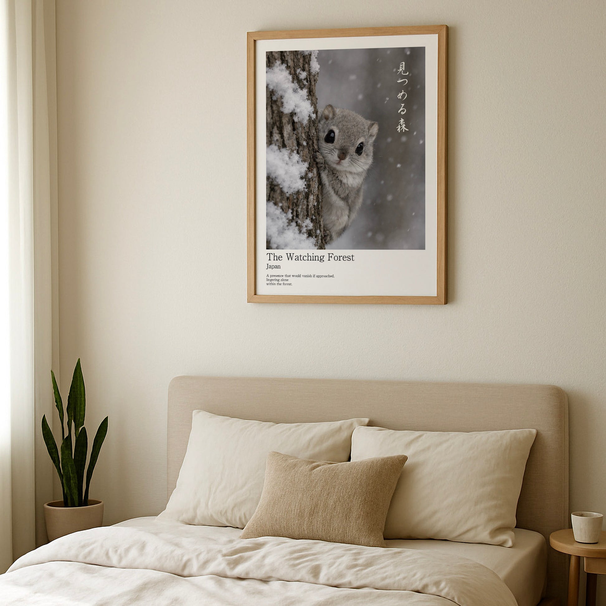 Bring a quiet sense of wonder into your space with this Japanese flying squirrel art print, inspired by the delicate stillness of winter forests.