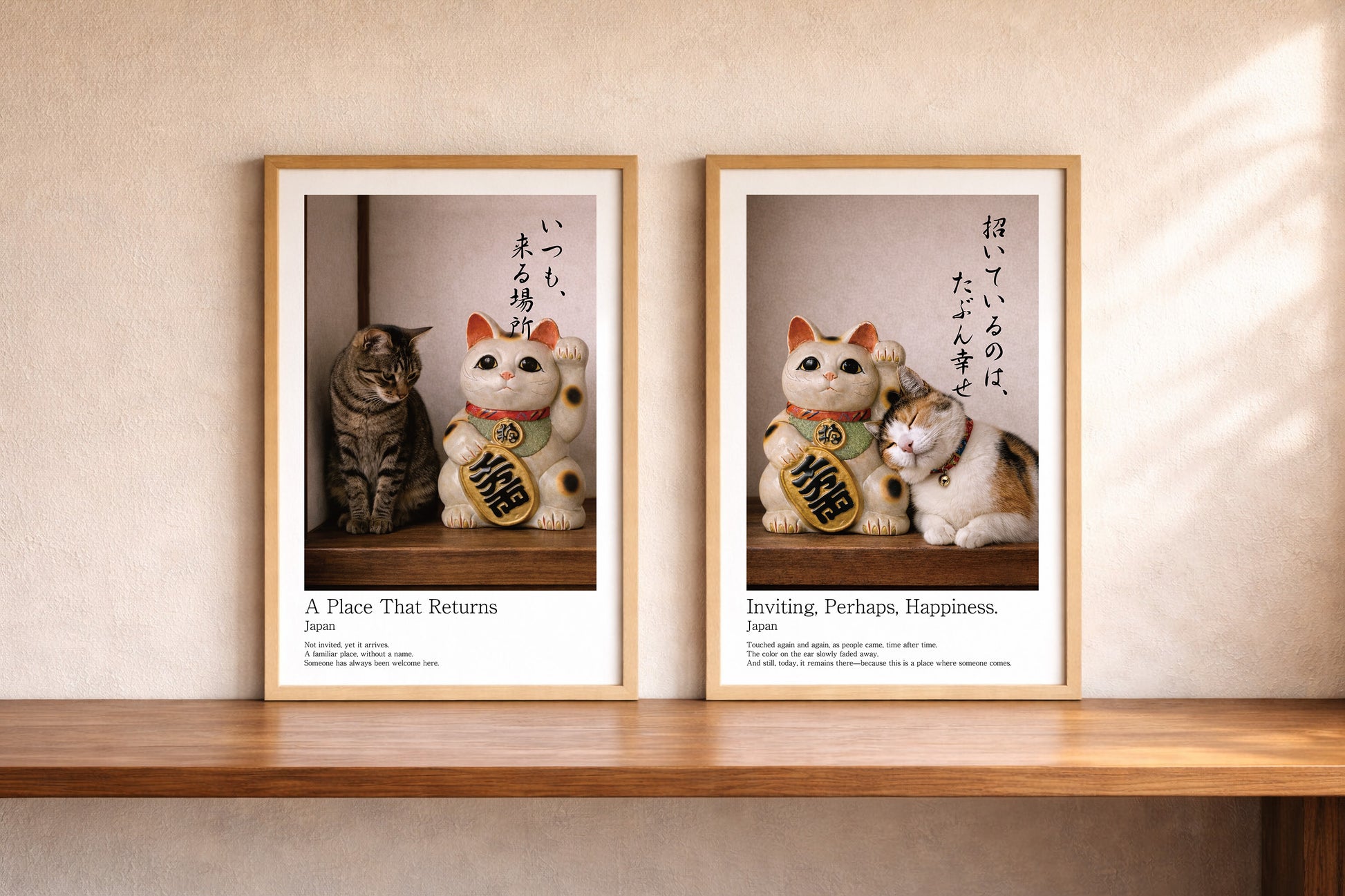 Bring a quiet sense of warmth and belonging into your home with this Japanese-inspired wall art, featuring a gentle tabby cat sitting beside a traditional Maneki Neko.